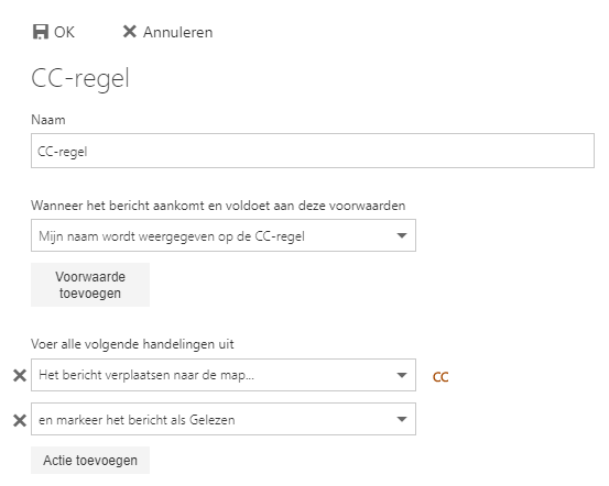Persoonlijk heb ik niet voldoende tijd om al mijn CC-e-mails te lezen. Daarom ga ik er vanuit dat iemand echt iets op mijn TODO-lijst wil zetten, me wel in het vak “AAN” zal vermelden. Sinds kort heb ik namelijk een regel ingesteld op mijn postvak die zorgt dat de mail waarin ikzelf als CC-ontvanger sta automatisch in een afzonderlijke map terecht komt. Denkende dat het daarmee opgelost was merkte ik dat ik ondanks tijdsgebrek toch nog veel tijd stak om door deze map te gaan. Nu heb ik de regel gewijzigd dat die e-mail ook meteen als gelezen wordt gemarkeerd.